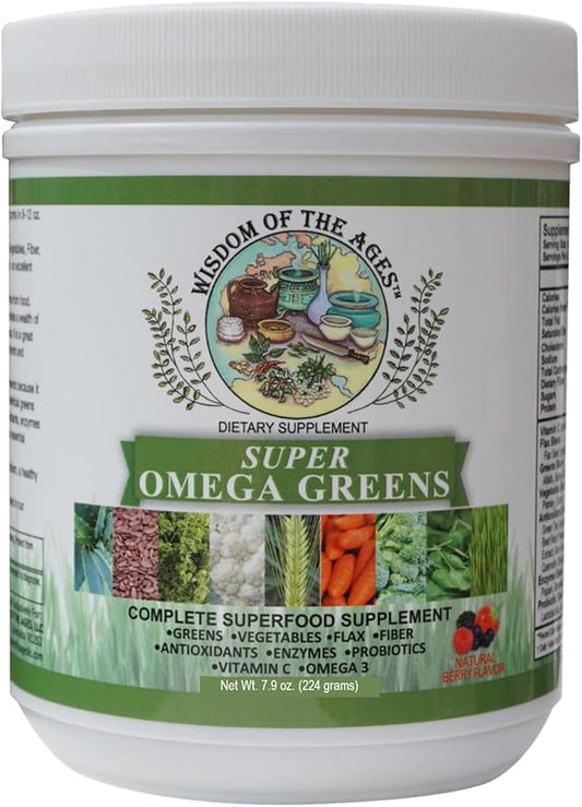 Super Omega Greens Complete Superfood Supplement with Greens, Vegetables, Flax, Fiber, Antioxidants, Enzymes, Probiotics, Vitamin C and Omega 3-7.9oz Powder