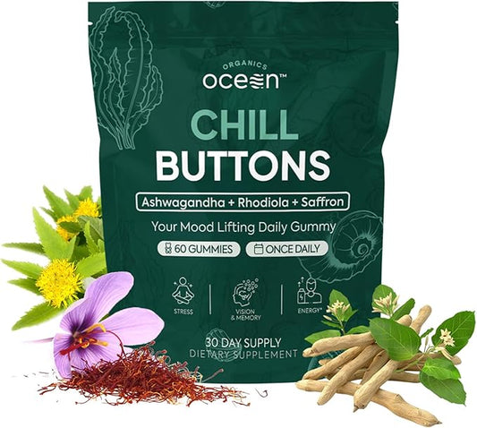 Chill Buttons - Organic Ashwagandha Reduces Tension, Enhances Memory and Vision, and Brightens Mood - Contains Ashwagandha KSM-66, Rhodiola Rosea, and Organic Saffron