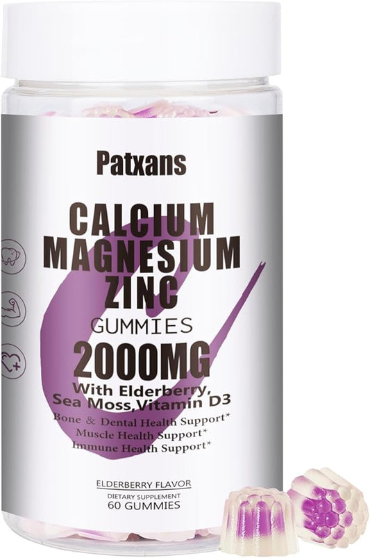 1 Pack 2000MG Calcium Magnesium Zinc Gummies with Vitamin D3 & Elderberry, Sea Moss for Bone & Tooth Strength, Muscle & Immunity, Sugar-Free, Vegan, Blueberry Flavor, 60ct.