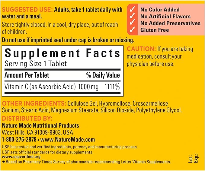 - These Nature Made Vitamin C 1000mg tablets are Vitamin C supplements that help support immune health and provide antioxidant support