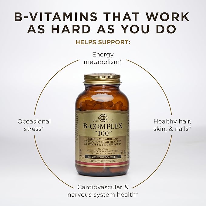 Solgar B-Complex "100", 250 Vegetable Capsules - Heart Health - Nervous System Support - Supports Energy Metabolism - Non-GMO, Vegan, Gluten Free, Dairy Free, Kosher, Halal - 250 Servings