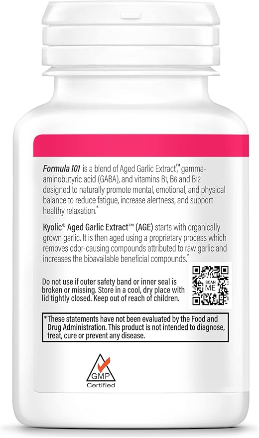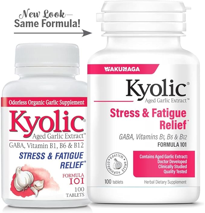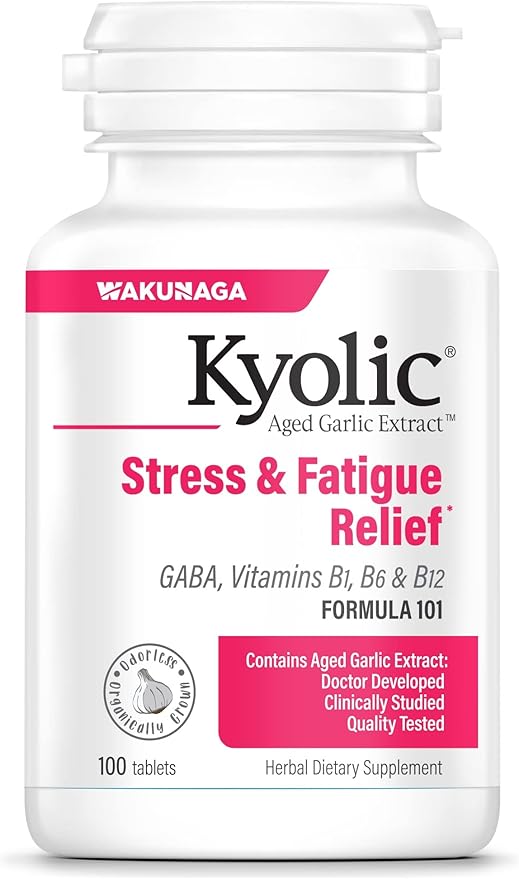 - Kyolic Stress and Fatigue Relief: Containing Aged Garlic Extract, gamma-amino butyric acid (GABA), Vitamins B1, B6 and B12, this supplement is designed to promote stress and fatigue relief; Made from organic and aged garlic
