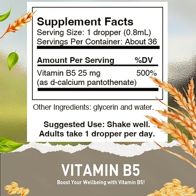 - EASY TO ABSORB LIQUID FORM: These vitamin B5 drops offer a liquid form designed for easy absorption. Available in 1oz, 8oz, and 16oz bottles, they provide convenient dosing options. The liquid format supports a simple way to include vitamin B5 in daily health routines without the need for capsules or tablets.