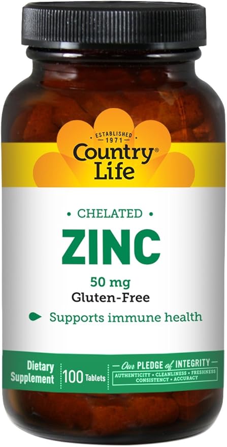 Country Life Chelated Zinc 50 mg - Certified Gluten-Free & Vegan Immune Support Supplement, Enhances Zinc Absorption, Supports Body’s Protein Production & Cellular Health, 100 Vegetarian Tablets