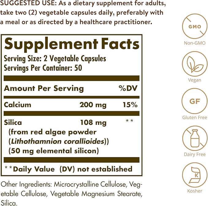 - Bone Health; Silicon intake has been positively associated with bone health; Solgar Oceanic Silica from Red Algae is an excellent source of calcium