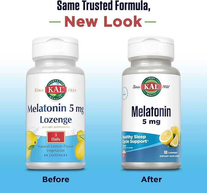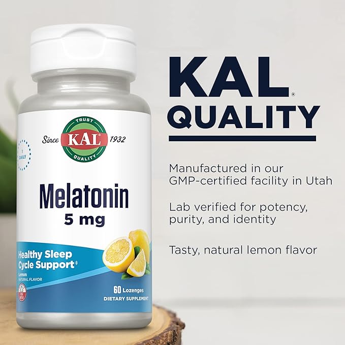 KAL Melatonin 5mg Sleep Aid Lozenges, Melatonin Supplement Supports Sleep Quality, Calming Relaxation and a Healthy Sleep Cycle, with Added Vitamin B6, Vegetarian, Natural Lemon Flavor, 60 Lozenges