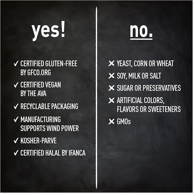 - CONTAINS ABSOLUTELY NO: Yeast - Corn - Wheat - Soy - Milk - Salt - Sugar - Preservatives - Artificial Colors - Artificial Flavors - Artificial Sweeteners
