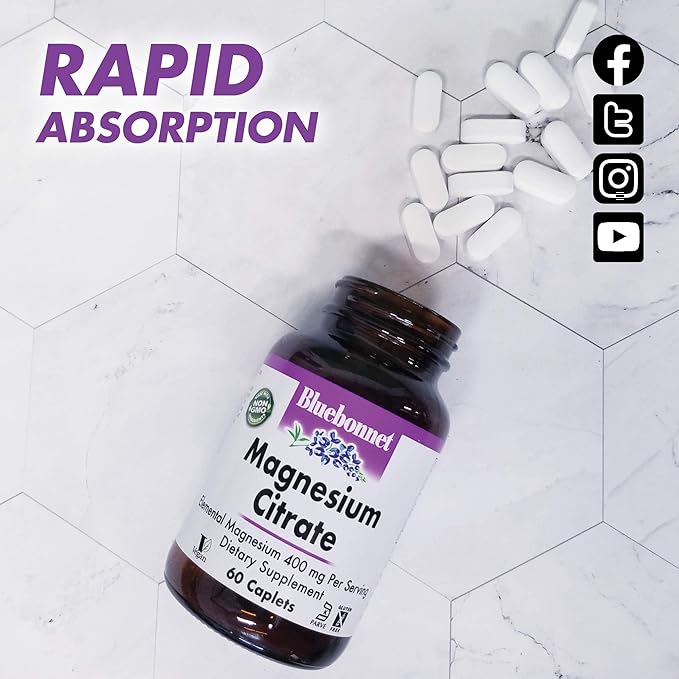 Bluebonnet Nutrition Magnesium Citrate (400mg of Magnesium)- Maximum Absorption - Supports Immune Health & Energy Production - Soyfree, Gluten-Free, Non-GMO, Kosher, Dairy Free, Vegan, 60 Caplets