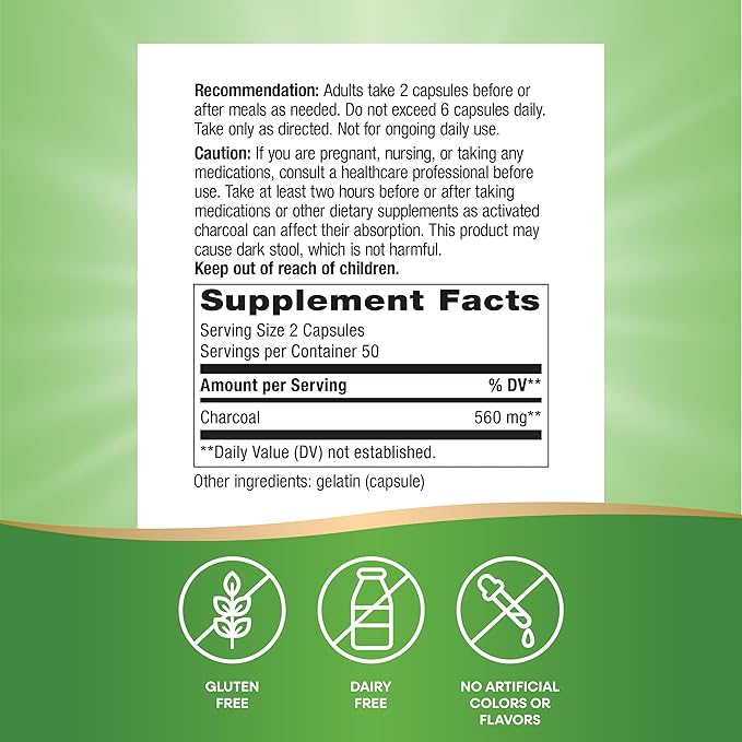 - Nature's Way Activated Charcoal contains 560 mg of charcoal per 2-capsule serving, which binds to unwanted materials and gas in the digestive tract*