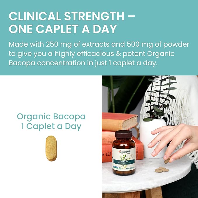 Himalaya Organic Bacopa Monnieri Nootropic Herbal Supplement, Supports Calm, Memory, Cognition, USDA Certified Organic, Non-GMO, 750 mg, 60 Plant-Based Caplets, 60 Day Supply