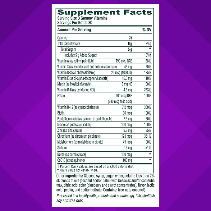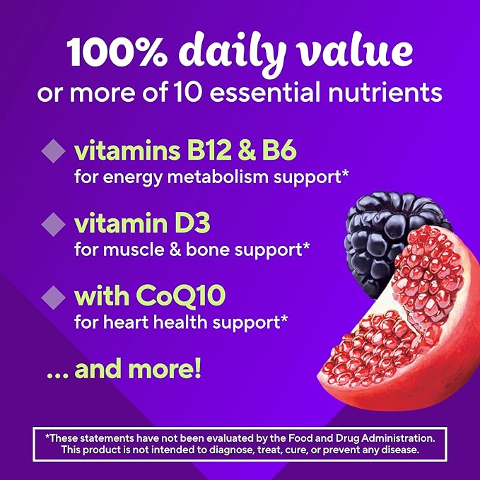 - Each 3-gummy serving provides 14 essential nutrients, like vitamin A and vitamin C, to support cellular energy production, muscle, and immune health (1), plus CoQ10 for antioxidant support to help fight free radicals (1)