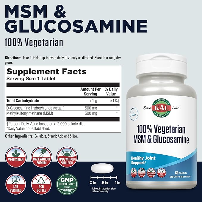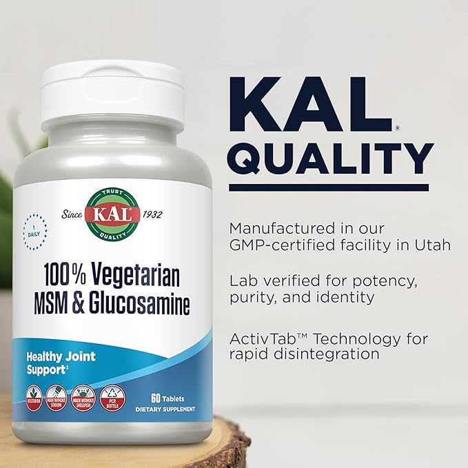 KAL 100% Vegetarian MSM & Glucosamine - Healthy Joint Support - Vegan Glucosamine and MSM Supplement - Made Without Shellfish - Lab Verified - 60-Day Guarantee - 60 Servings, 60 Tablets