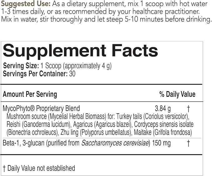 - NURTURE YOUR HEALTH: The mushrooms in MycoPhyto Complex provide broad-spectrum immune benefits, nootropic brain support, immune function and vital energy. Beta-glucan is one of the most powerful immune-activating phytochemicals*