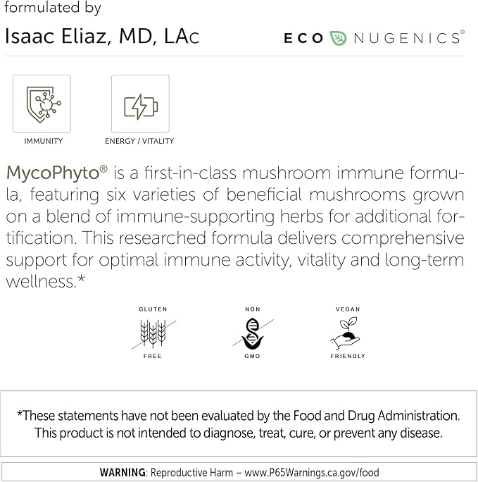 - PROFESSIONALLY FORMULATED BY DR. ISAAC ELIAZ M.D.: MycoPhyto is formulated in the USA by a leading authority of integrative medicine & cellular health, Dr. Isaac Eliaz M.D., founder of ecoNugenics, with 25+ years of clinical and research experience