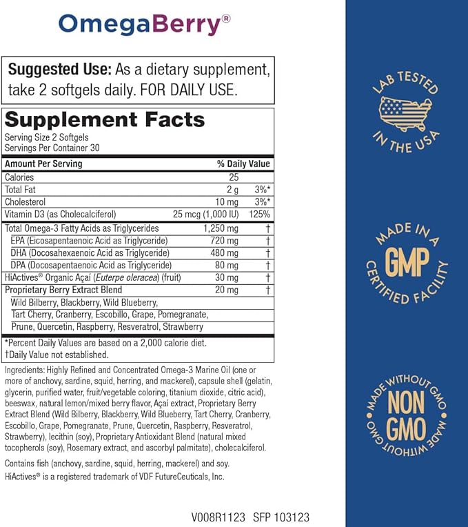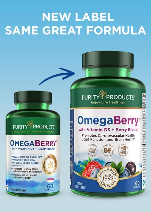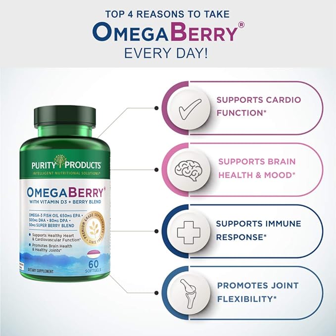 Purity Products OmegaBerry Fish Oil with Vitamin D3 and Organic Acai - 1250mg Concentrated Molecularly Distilled Ultra Pure Omega-3 Fish Oil, 500mg DHA + 650mg EPA - 60 Soft Gels - 30 Day Supply from