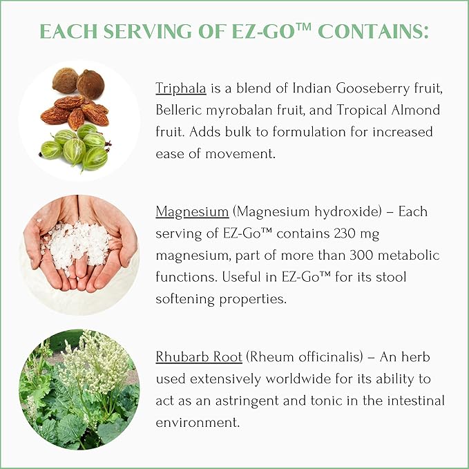 - Triphala (blend of Indian Gooseberry fruit, Belleric myrobalan fruit and Tropical Almond fruit) - Assist in adding bulk for easy release