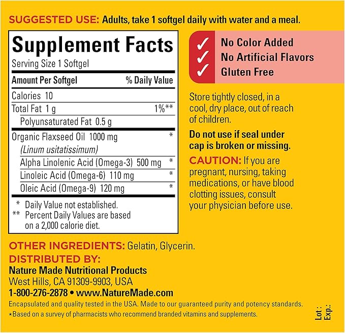 - Heart health support supplement: contains one 100 count bottle of Nature Made Flaxseed Oil 1000 mg Softgels for a 100-day supply