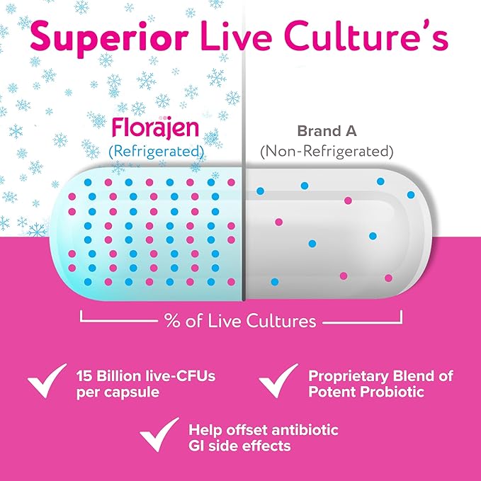 - COLD CHAIN COMMITMENT FOR POTENCY: Florajen ensures maximum potency with 15 billion live cultures per capsule through refrigeration, maintaining freshness and quality, providing you with a reliable probiotic supplement in every dose.