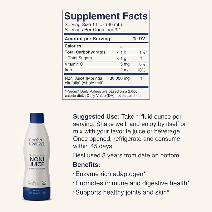 Earth's Bounty Tahitian Organic Noni Juice - 32 fl.oz - 100% Pure, Natural Immune & Joint Support - Organic, Kosher Noni Juice - No Additives