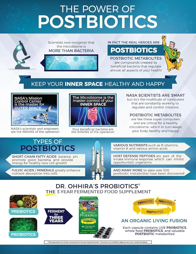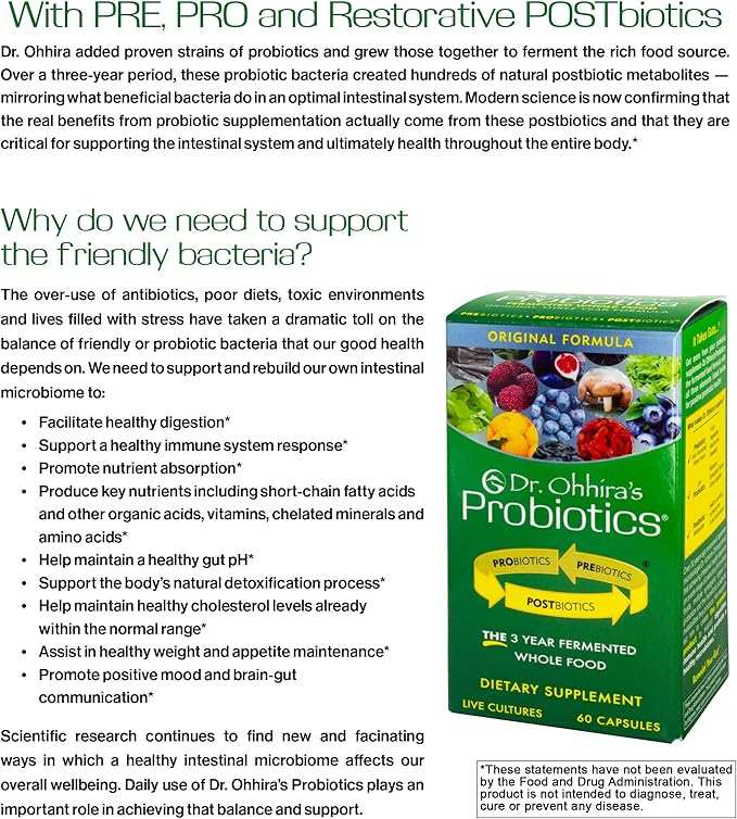 - DR. OHHIRA’S ORIGINAL PROBIOTIC CAPSULE contains prebiotics (the fruits and vegetables) with strong and effective probiotic bacteria (12 strains) and POSTBIOTIC METABOLITES.