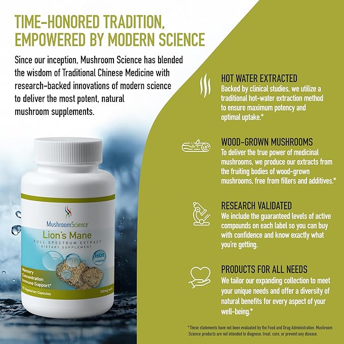 - QUALITY INGREDIENTS: Our MushroomScience Lion's Mane Full Spectrum Extract is crafted with quality Lion's Mane mushrooms. Each vegetarian capsule contains 300mg of pure Lion's Mane extract, providing you with the natural benefits of this remarkable mushroom in every dose.
