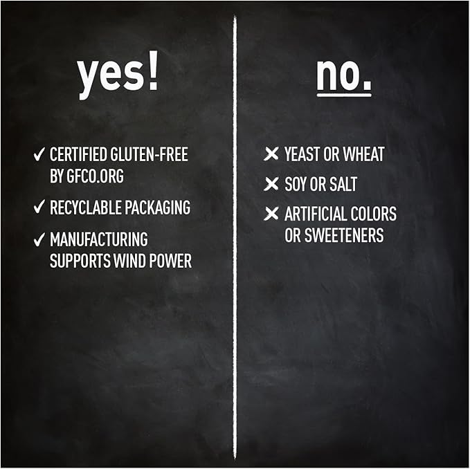 - CONTAINTS ABSOLUTELY NO: Yeast - No Wheat - No Soy - No Salt - No Preservatives - No Artificial Colors - No Artificial Sweeteners