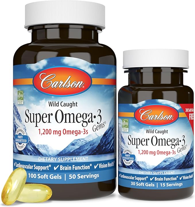 Carlson - Super Omega-3 Gems, 1200 mg Omega-3 Fatty Acids with EPA and DHA, Wild-Caught Norwegian Supplement, Sustainably Sourced Fish Oil Capsules, Omega 3 Supplements, 100+30 Softgels