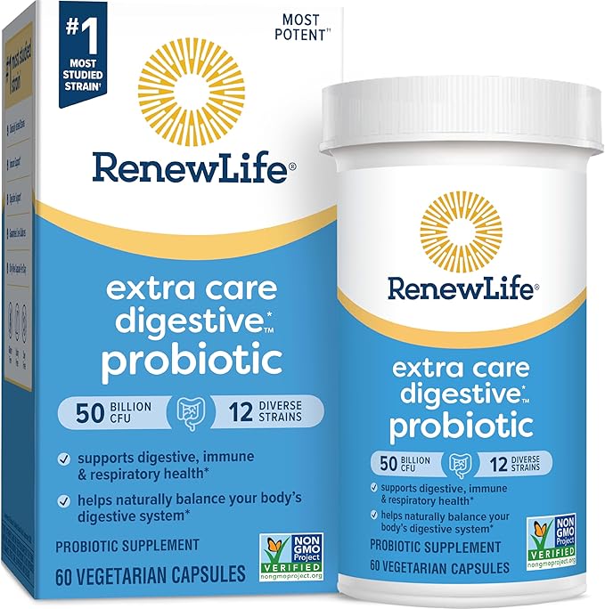 Renew Life Extra Care Digestive Probiotic Capsules, 50 Billion CFU Guaranteed, Daily Supplement Supports Immune, Digestive, Respiratory Health(1), L. Rhamnosus GG, Dairy, Soy and Gluten-Free, 60 Count