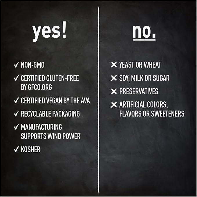 - Certified gluten-free, vegan and kosher; No yeast, wheat, soy, milk, sugar, preservatives, artificial colors, flavors or sweeteners