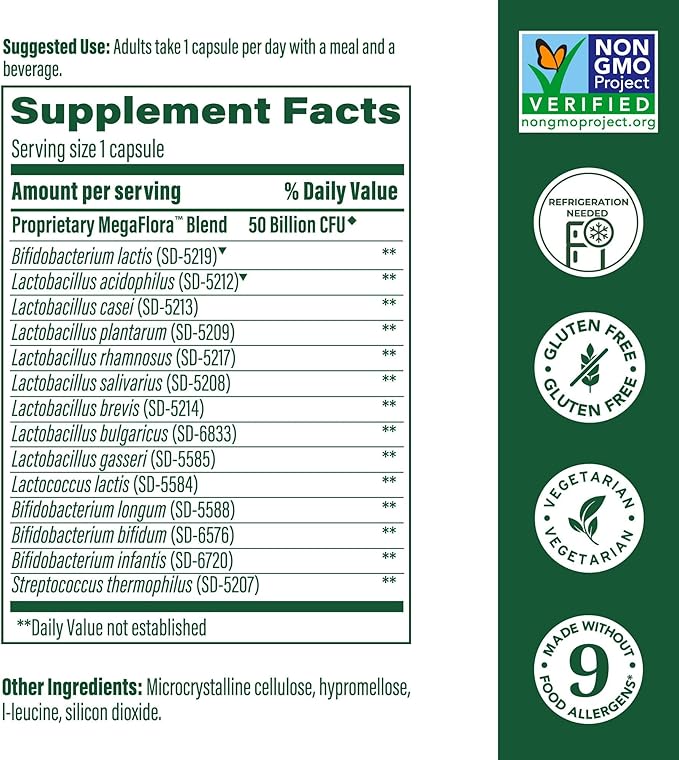 MegaFood MegaFlora Probiotic Plus - Probiotics for Women Digestive Health- Probiotics for Men - 50 Billion CFUs & 14 Strains - Immune Support Supplement - Vegetarian - 30 Capsules, 30 Servings