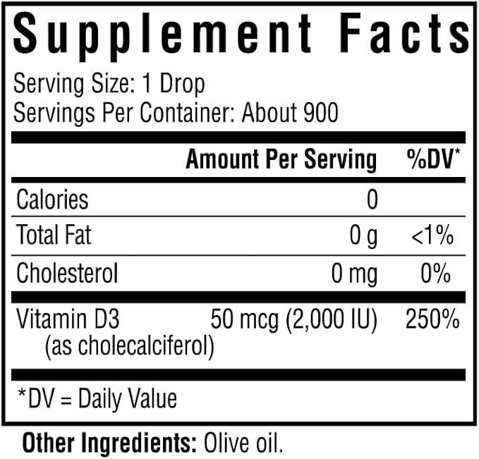 - Easy-to-take: 1 drop provides 50mcg (2,000 IU) of liquid vitamin D3 (as cholecalciferol). Only one drop by mouth daily is needed