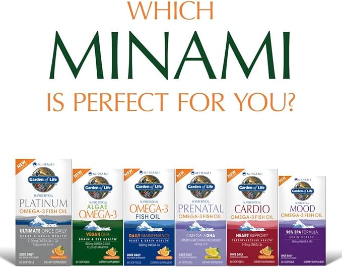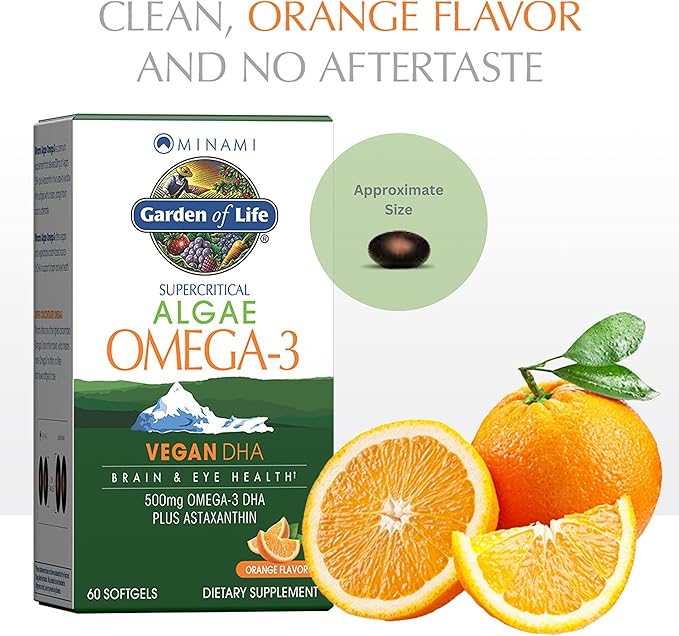 Garden of Life Minami Algae Omega 3 Vegan DHA for Brain and Eye Health - Orange Flavor, 500mg Plant Based DHA Omega-3 Vegan Algae Oil Plus Astaxanthin, No Aftertaste, 60 Easy-to-Swallow Mini Softgels