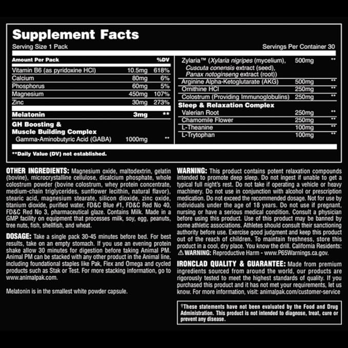 - Helps promote more efficient, restful sleep: Animal PM delivers a complete Sleep Supplement and Relaxation Complex to help you get your fullest, deepest sleep. After all, when you sleep, you grow. Each container has 30 days supply