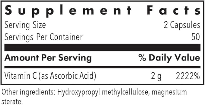 Allergy Research Group Pure Vitamin C Supplement - Ascorbic Acid, 1000mg Organic Vitamin C, High Potency, Unbuffered, Mild Acidity, Vegetarian Capsules - 100 Count