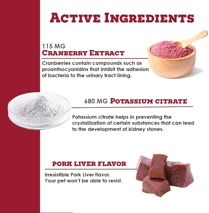 - UNIQUE AND ACTIVE INGREDIENTS - The K-Plus cranberry supplement for puppies active ingredient Potassium Citrate, helps promote proper urine mineral balance while supporting normal kidney detoxification and healthy waste elimination. Potassium Citrate helps maintain normal urine pH. When pH is normal in urine and less acidic, the kidneys don't form kidney stones. The other active ingredient, Cranberry, assists in maintaining normal bladder health and control.