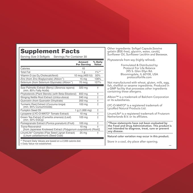 PROTOCOL FOR LIFE BALANCE Prostate-B Clinical Strength - Prostate Health Supplement for Men - with Beta Sitosterol, Lycopene & Saw Palmetto - Halal & Dairy Free - 90 Softgels