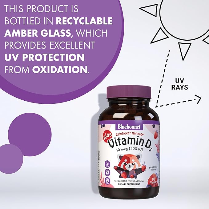Bluebonnet Nutrition Rainforest Animalz Vitamin D3 400 IU Chewable Tablet, Soy, Dairy & Gluten-Free, Non-GMO, Kosher Certified, Vegetarian Friendly, Natural Mixed Berry Flavor, 90 Count