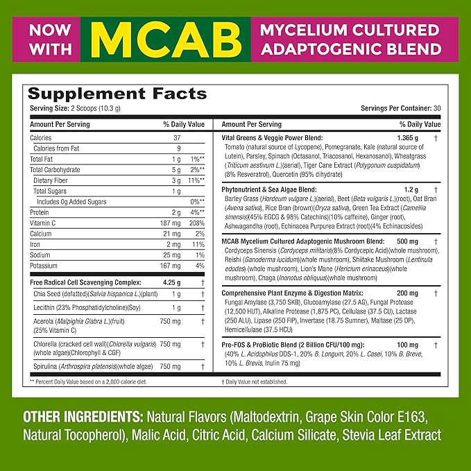 Nutrition’s Green Supreme Fusion Blend Antioxidant: Super Greens Smoothie Mix with Spirulina, Chlorella, Adaptogenic Mushrooms, 30 Servings