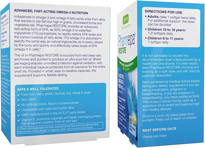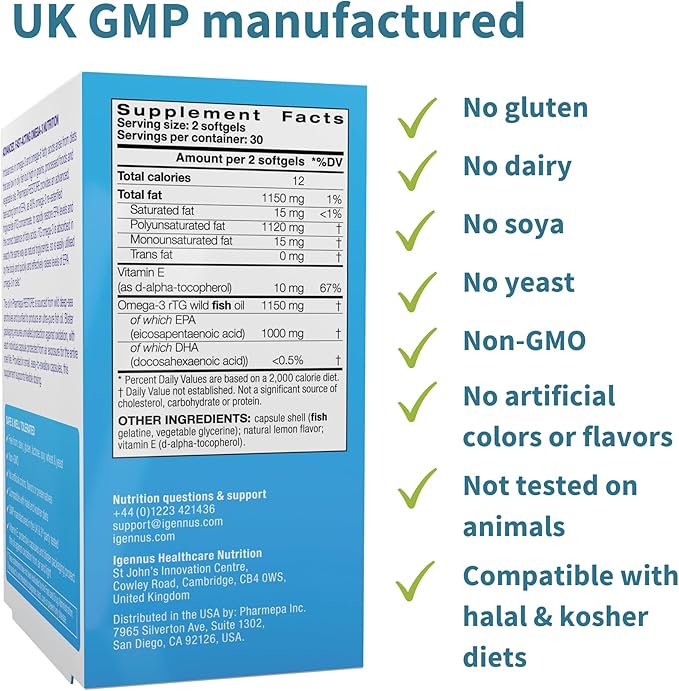 Igennus Pharmepa Restore, 1000mg Pure EPA Omega-3 Triglyceride Form Fish Oil, IFOS Certified, Highly Absorbable rTG Form, 90% Concentration, Wild & Sustainable, Lemon Flavour, 60 Softgels