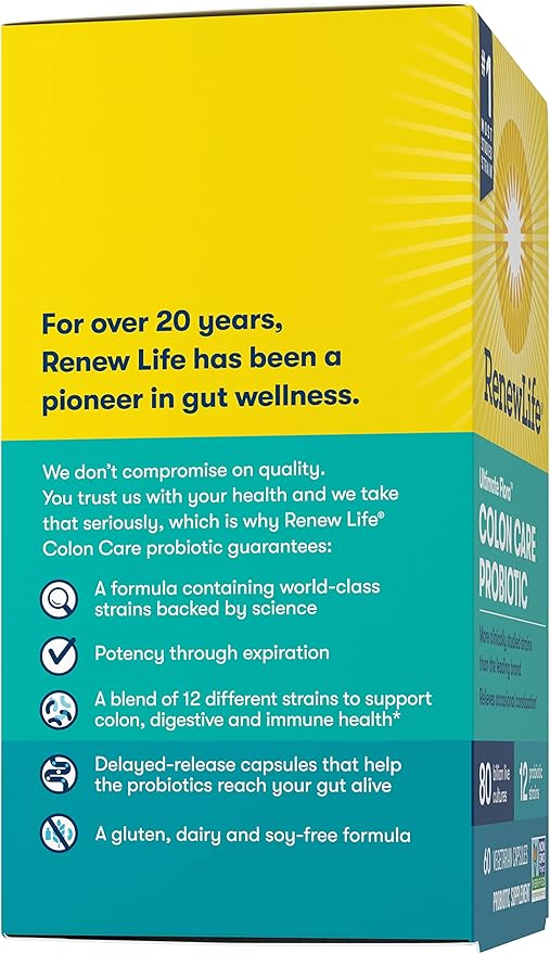 Renew Life Probiotic Colon Care Probiotic Capsules, Daily Supplement Offers Colon Support, L. Rhamnosus GG, Dairy, Soy and gluten-free, 80 Billion CFU, 60 Count