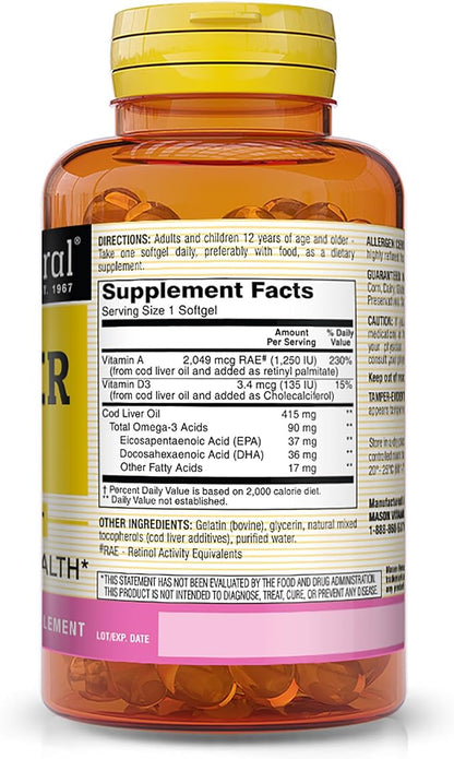 MASON NATURAL Cod Liver Oil Plus Vitamin A & D3 - Healthy Heart and Brain Function, Improved Immunity, Supports Overall Health, 100 Softgels