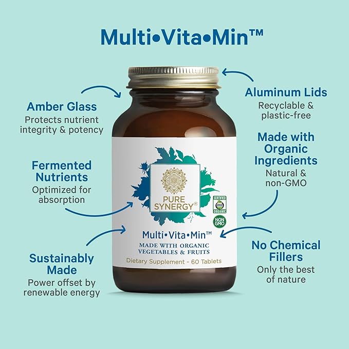 PURE SYNERGY Multi·Vita·Min | Vegan Multivitamin Made with Organic Whole Foods | Twice Daily Supplement for Men and Women | Core Nutrients for Energy, Mood, Immune, and Bone Health (60 Tablets)