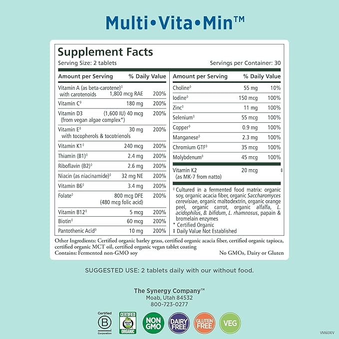 - REAL INGREDIENTS YOU CAN TRUST DAILY: Made with Organic, Non-GMO, Vegan, Gluten-Free, and Dairy-Free. Suggested use: Take 2 tablets per day with or without food.