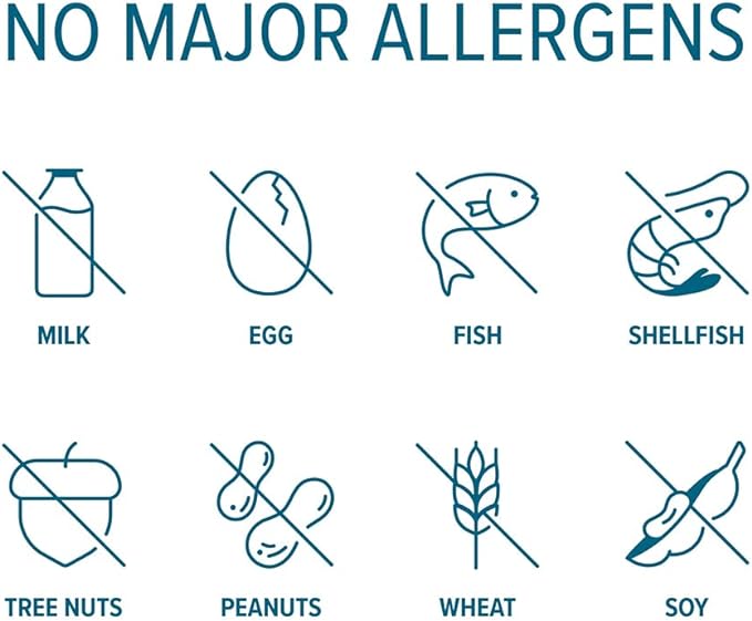 - Free from: Eggs, fish, gluten, GMO, milk, peanuts, shellfish, soy, sesame, tree nuts, wheat, artificial colors, artificial flavors, and artificial preservatives