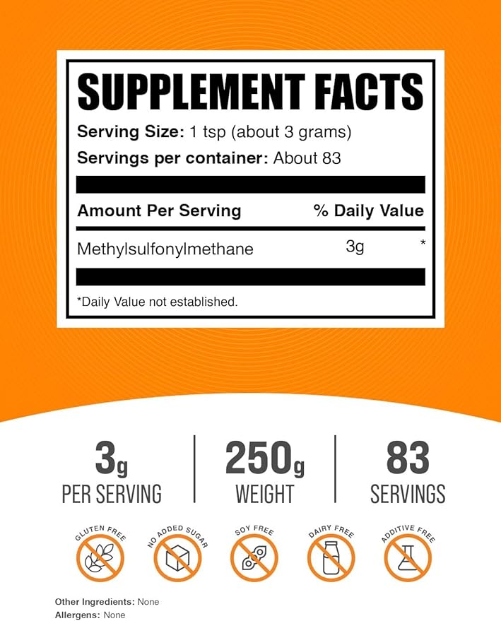 BulkSupplements.com MSM Powder - Methylsulfonylmethane, MSM Supplement, Nutritional Supplement - Gluten Free, 3g per Serving, 250g (8.8 oz) (Pack of 1)