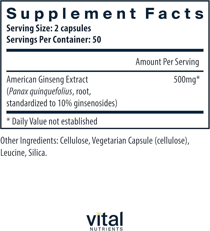 Vital Nutrients - American Ginseng - Energy Support - Mental and Physical Endurance - 100 Vegetarian Capsules per Bottle - 250 mg