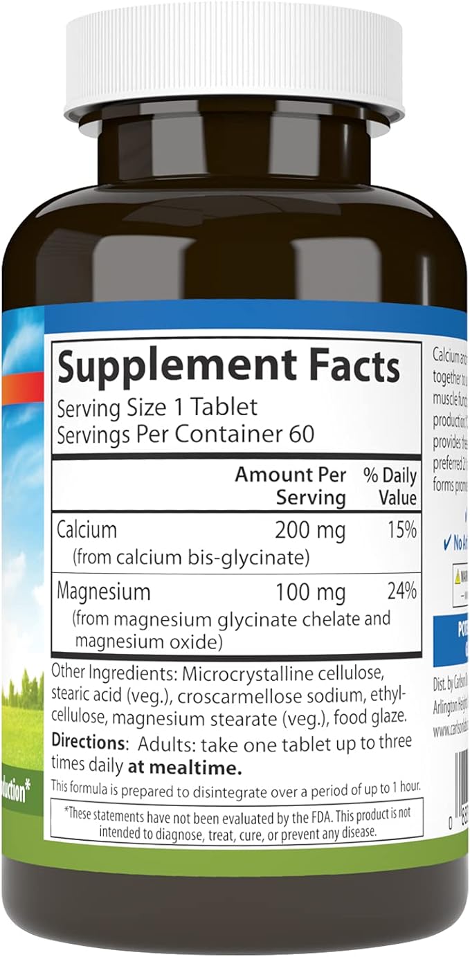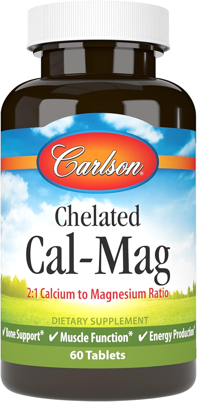 Carlson - Chelated Cal-Mag, 2:1 Calcium to Magnesium Ratio, Bone Support, Muscle Function & Energy Production, 60 Tablets