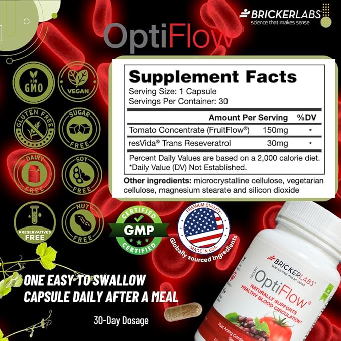 - Natural Blood Flow Supplement: One capsule of OptiFlow provides the benefits of three bowls of tomato soup and 99 percent of pure trans-resveratrol a polyphenol. This natural and premium Blood Flow Supplement helps keep platelets smooth and encourages blood vessels dilation to help boost and maintain healthy blood flow. A natural blood flow optimizer