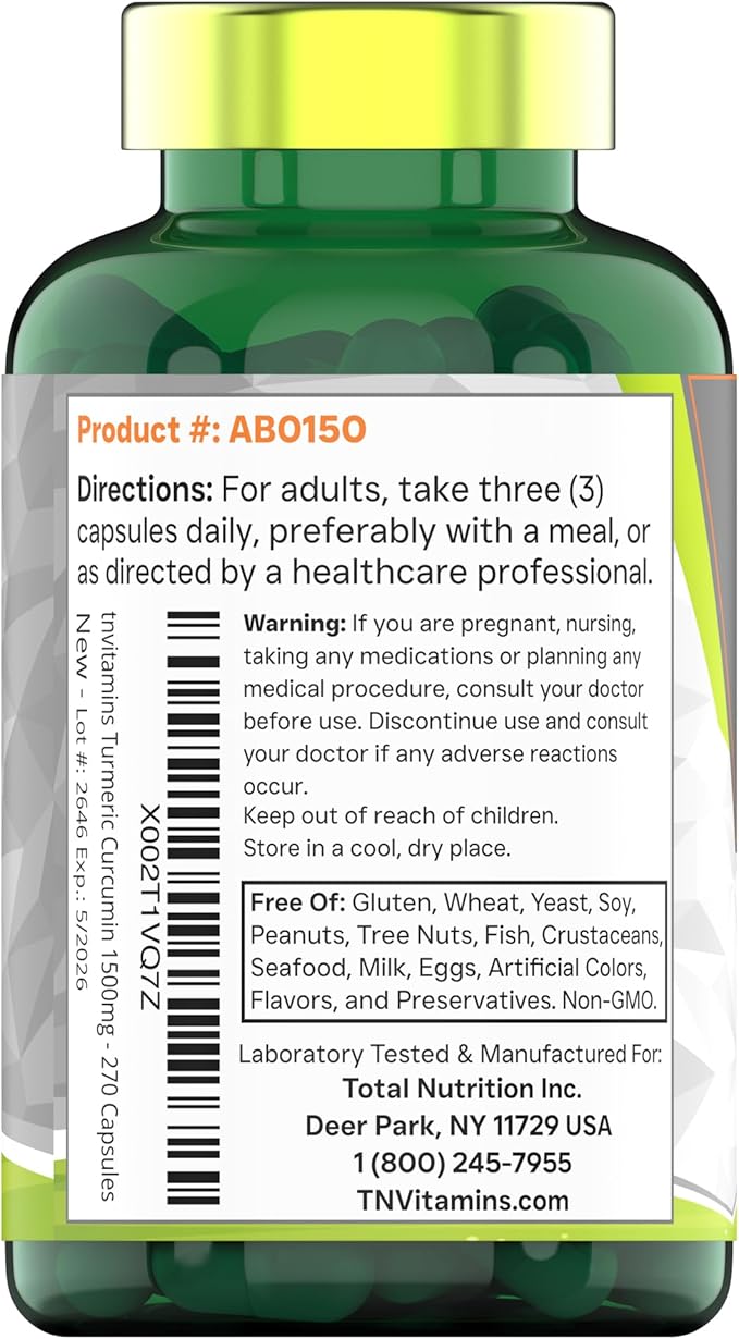 - ✔️ 1500 MG of Turmeric Curcumin Per Serving | 270 Capsules | 3 Month Supply!