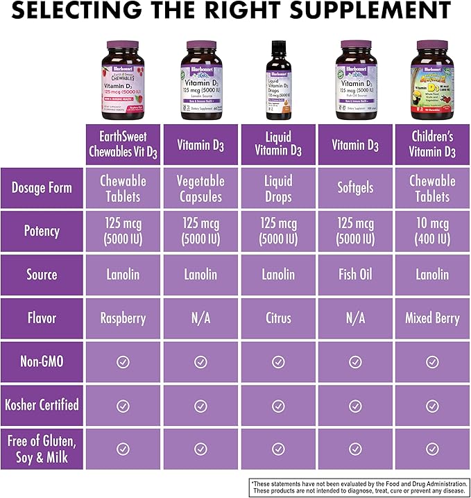 Bluebonnet Nutrition Earth Sweet Vitamin D3 5000 IU Chewable Tablets, Aids in Muscle & Skeletal Growth, Non GMO, Gluten & Soy & Milk Free, Kosher, Raspberry, White, 90 Count